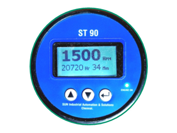 ST 90 is an indigenously developed digital Tachometer designed to work in tough industrial environments. Efficiently monitors engines in Diesel gensets or engine only applications for measuring the RPM. ST-90 takes input from Charging Alternator pulse or through Magnetic pick up. Provided with user configurable keys, ST 90 exhibits engine RPM, run hours in clear backlit LCD display. Also has the ability to monitor and display battery voltage. Sun Smart Tacho meter has undergone type test as per IEC 60068 series.